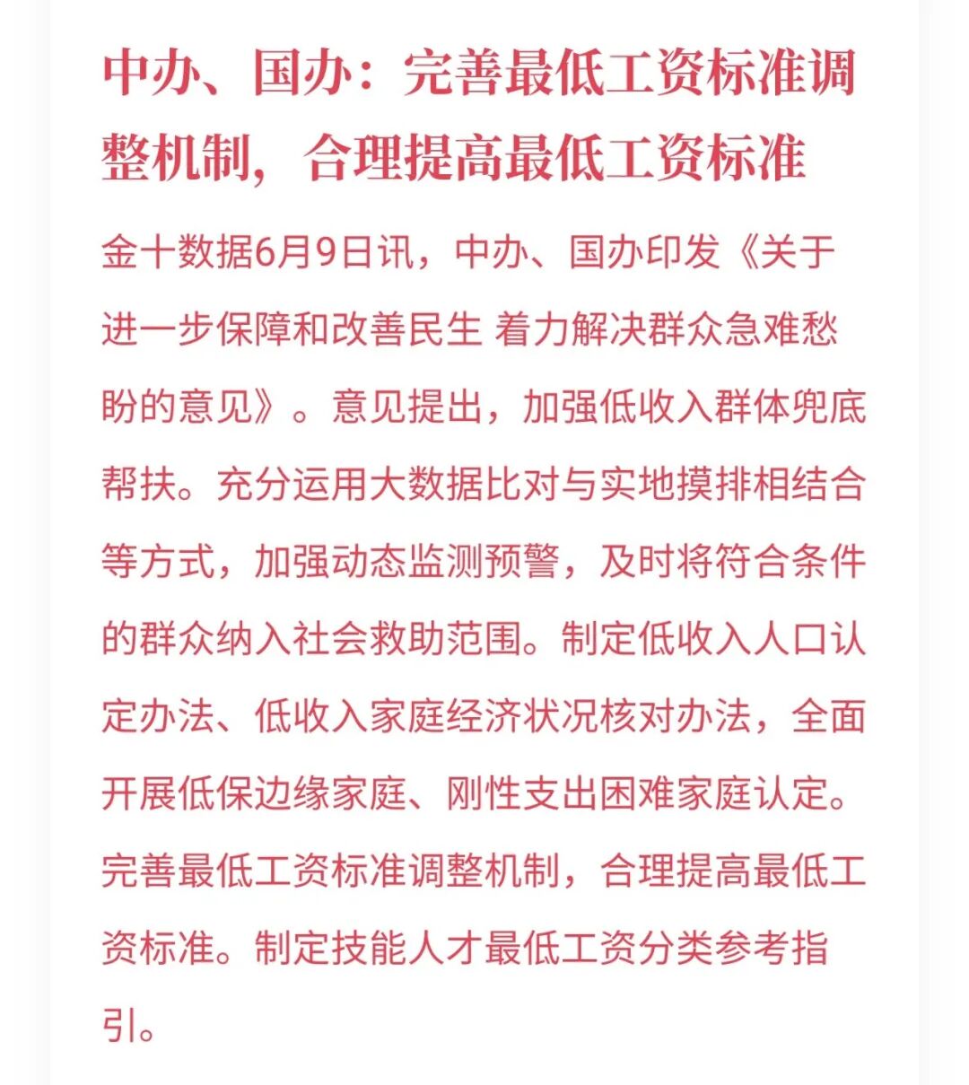日前,中办、国办联合发文强调,“完善最低工资标准调整机制,合理提高最低工资标准”。