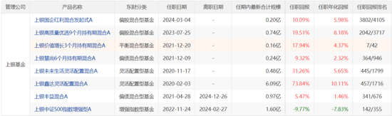 《聪明投基者》还注意到,陈博的在管基金中,还有几只规模不到5000万元的“迷你基”。例如上银国企红利混合发起式A类和C类基金份额加起来才2000万元,上银未来生活灵活配置混合A类和C类基金份额加起来也不超过4000万元。如果业绩还不见起色,这两只基金就面临清盘风险。