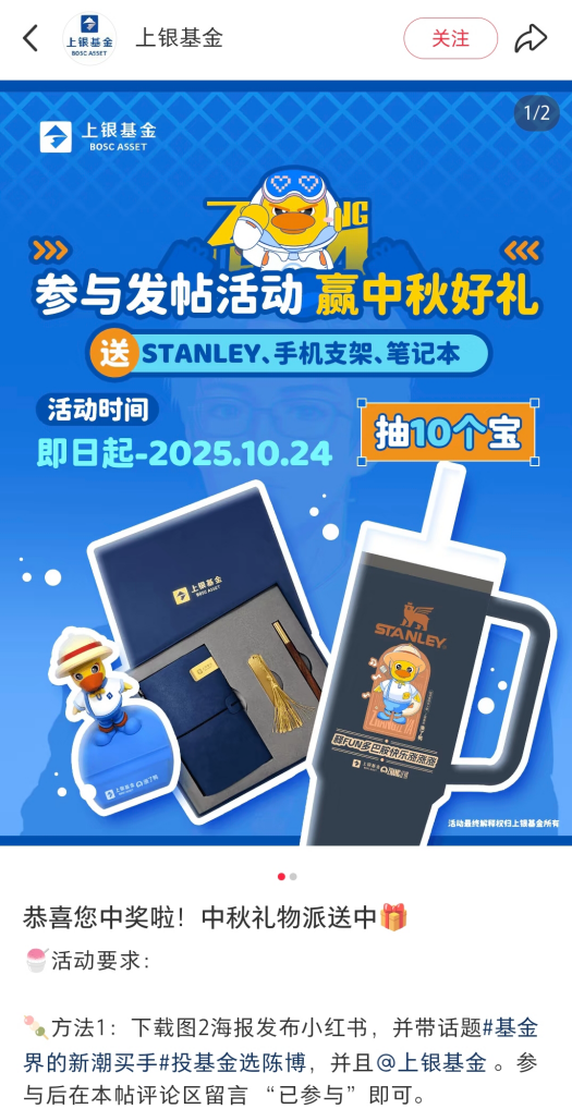 为了让事件发酵,上银基金还在小红书上发起了发帖送好礼活动,需要用户将陈博大头像的海报或线下拍摄带有陈博大头像的广告发在小红书上并带上话题,便有机会抽取手机支架、笔记本等礼品。