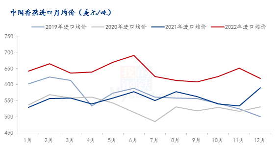 如图所示,2022年12月份香蕉进口均价约为619.13美元/吨,环比下降4.85%,同比上涨5.01%。各国香蕉价格有涨有跌,其中价格涨幅最大的国家为柬埔寨,12月份柬埔寨香蕉进口价格约为699.86美元/吨,较11月份上涨10.07%;价格跌幅最多的国家为菲律宾,12月份菲律宾香蕉进口价格约为624.35美元/吨,较11月份下跌4.02%。