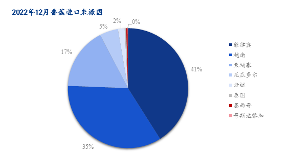 2022年12月份,中国最大的香蕉进口来源国仍为菲律宾,占比41%,较上月减少4个百分点;第二位为越南,占比35%,较上月增加12个百分点;柬埔寨位于第三位,占比17%。12月中旬,中老铁路首列冷链香蕉国际班列接收仪式在湖南(红星)农产品流通产业园隆重举行,水果冷链专列优势明显,东盟国家输华水果可以通过中老铁路直接运抵云南,不再需要卡车转运,运输时间和费用都大大下降。