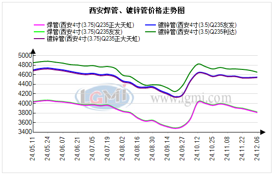 今日西安焊接钢管市场价格持稳运行,比上个交易日成交一般。兰格钢铁云商平台监测数据显示,截至2024年12月6日,西安焊接钢管价格:4寸(3.75)焊管过磅含税价:友发报3820元,正大报3810元,衡水京华3790元,君诚报3800元,比上个交易日报价稳;4寸(3.75) 镀锌管过磅含税价:利达报4650元,友发报4550元,正大报4540元,君诚报4500元,衡水京华报4500元,比上个交易日报价稳。