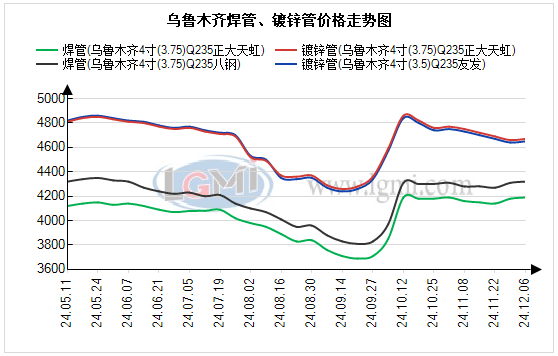 今日乌鲁木齐管材市场价格平稳运行,比上个交易日成交弱。兰格钢铁云商平台监测数据显示,截至2024年12月6日,乌鲁木齐市钢管价格:4寸(3.75)焊管过磅含税价:八钢报4320元,正大报4190元,君诚报4190元,比上个交易日报价暂稳;4寸(3.75)镀锌管过磅含税价:友发报4650元,正大报4670元,君诚报4630元,唐山华岐报4630元,正金元报4600元,比上个交易日报价稳。