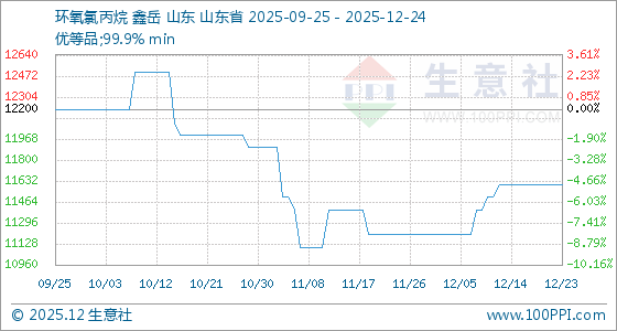 12月24日,生意社环氧氯丙烷基准价为11600.00元/吨,与本月初(11200.00元/吨)相比,上涨了3.57%。
