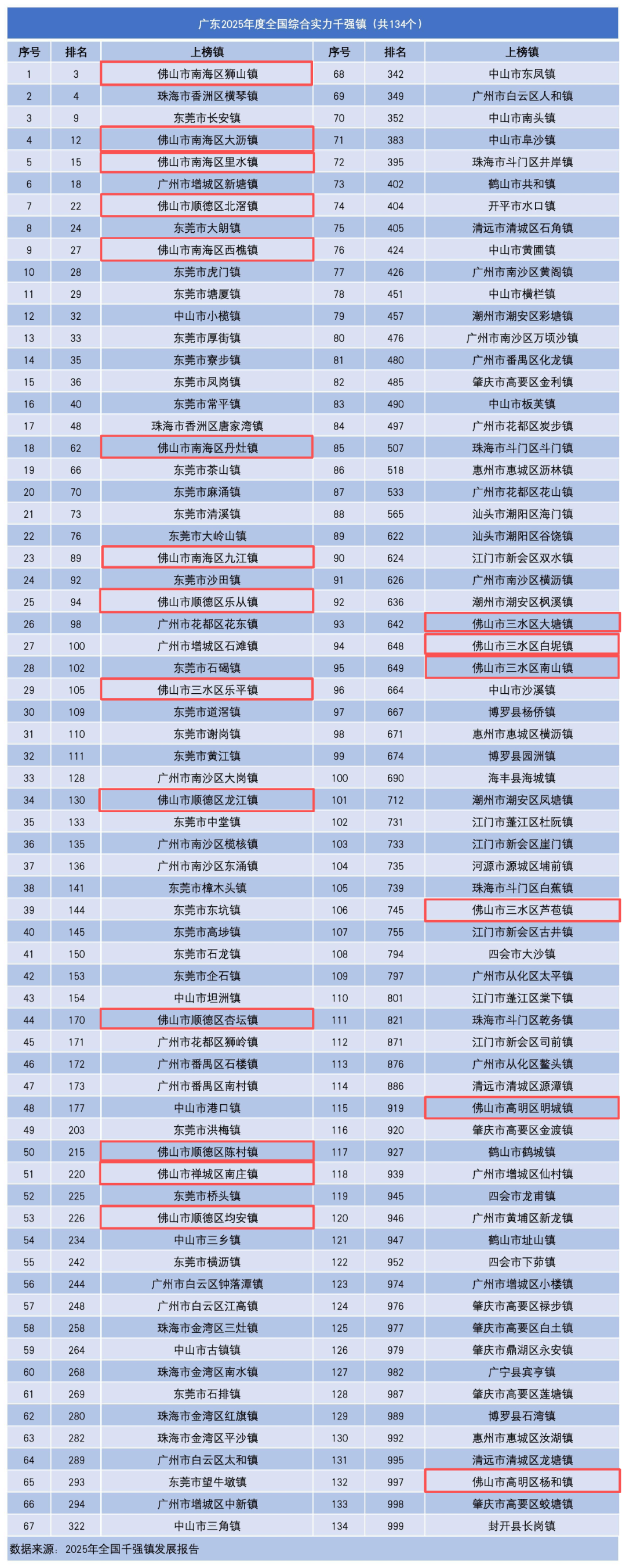 镇域经济是中小城市经济的重要组成,是区域经济增长的新引擎。9月19日,中国中小城市发展指数研究课题组和国信中小城市指数研究院发布2025年全国千强镇发展报告(以下简称“报告”),佛山20个镇上榜,包括禅城南庄;南海狮山、大沥、里水、西樵、丹灶、九江;顺德北滘、乐从、龙江、杏坛、陈村、均安;三水乐平、大塘、白坭、南山、芦苞;高明明城、杨和。