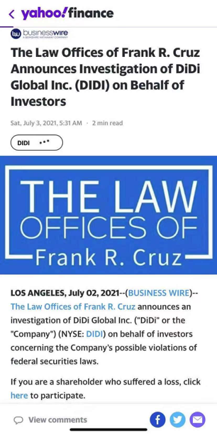据“慧保天下”了解,在滴滴被审查的消息发布之后不久,即有美国律所宣布准备集体诉讼。有专业人士认为,不能排除申请董责险理赔的情况,原因或与信息披露有关。