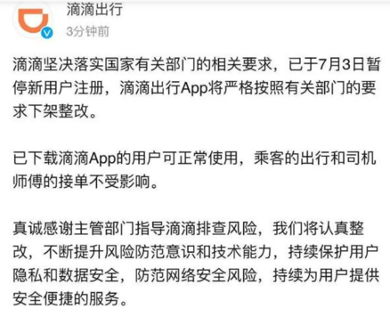 对此,滴滴作出快速回应,并发布公告称,坚决落实国家有关部门的相关要求,已于7月3日暂停新用户注册,滴滴出行App将严格按照有关部门的要求下架整改。