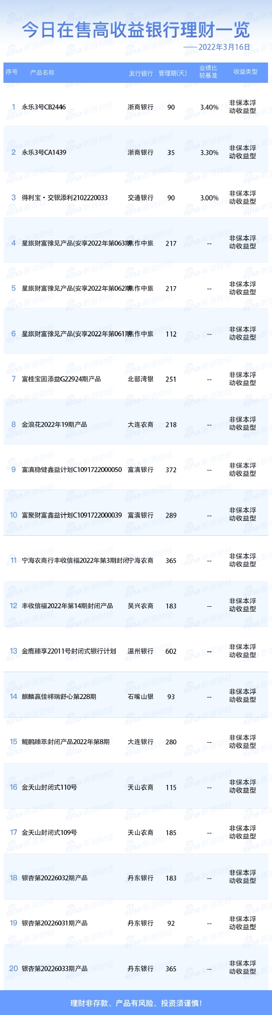 3月16日在售高收益银行理财产品一览。今日业绩比较基准在3.00%及以上的银行人民币理财产品共3款。理财非存款、产品有风险、投资须谨慎!