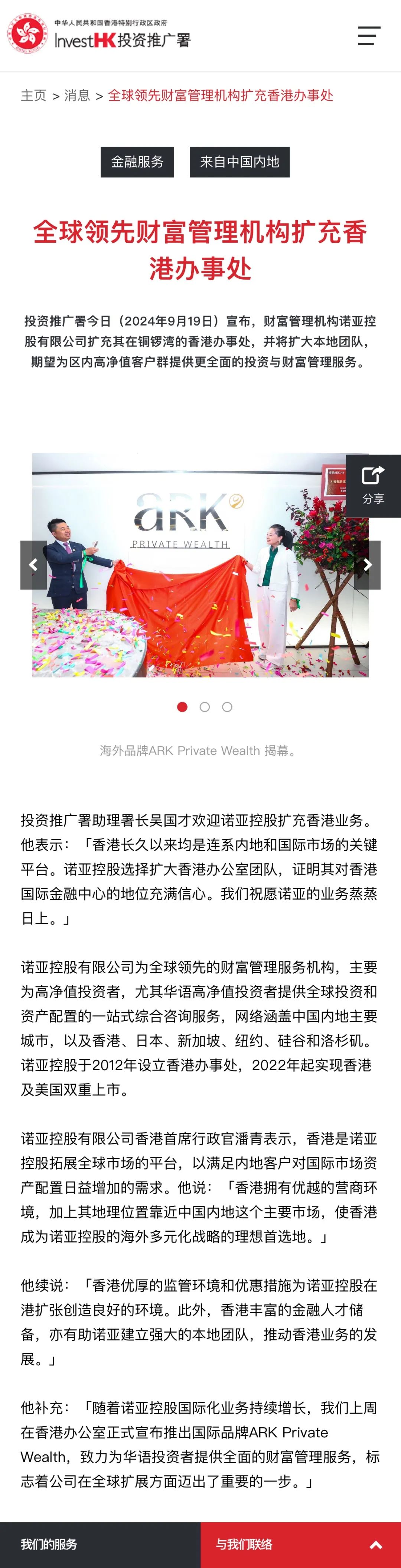 香港投资推广署(Invest HK )今日(2024年9月19日)于其官方网站宣布,财富管理机构诺亚控股有限公司扩充其在铜锣湾的香港办事处,并将扩大本地团队,期望为高净值客户提供更全面的投资与财富管理服务。