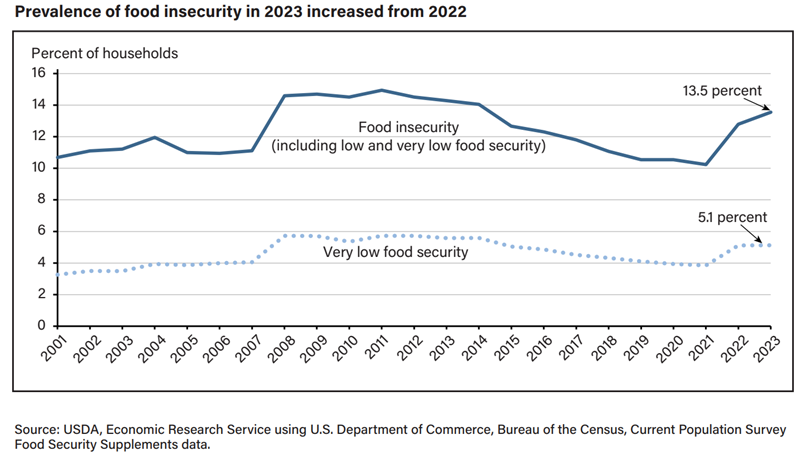 来源:美国住房和城市发展部根据美国农业部经济研究局的报告,美国2023年面临食品不足的人口比例已经接近2008-2014年的那轮高点。要知道,2023-2024年美国的失业率远低于2008-2014年,这一数据的明显上升显然意味着美国底层居民的生活并不富足。虽然2024年的数据尚未公布,但不出意外的话,这一比例应该会进一步上升。