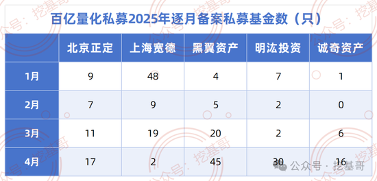 不止黑翼资产,明汯投资在4月份也是备案基金提速,继1月份7只,2月和3月各2只后,4月份明汯投资一举备案了30只私募基金。