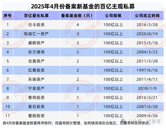除了百亿量化私募,日斗投资,和谐汇一资产,睿郡资产,东方港湾,合晟资产,红筹投资,乐瑞资产,宁泉资产,聚鸣投资,星石投资,重阳投资等11家百亿主观私募在4月份也备案了23只新基金。