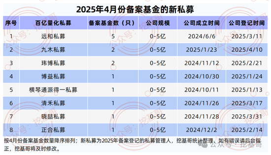 据挖基哥的不完全统计,远和私募、九木私募、玮博私募、博益私募、横琴通源得一私募、清禾私募、晓喆私募、正合私募等8家2025年登记的新私募均在4月份备案新产品,共计发行14只私募基金。