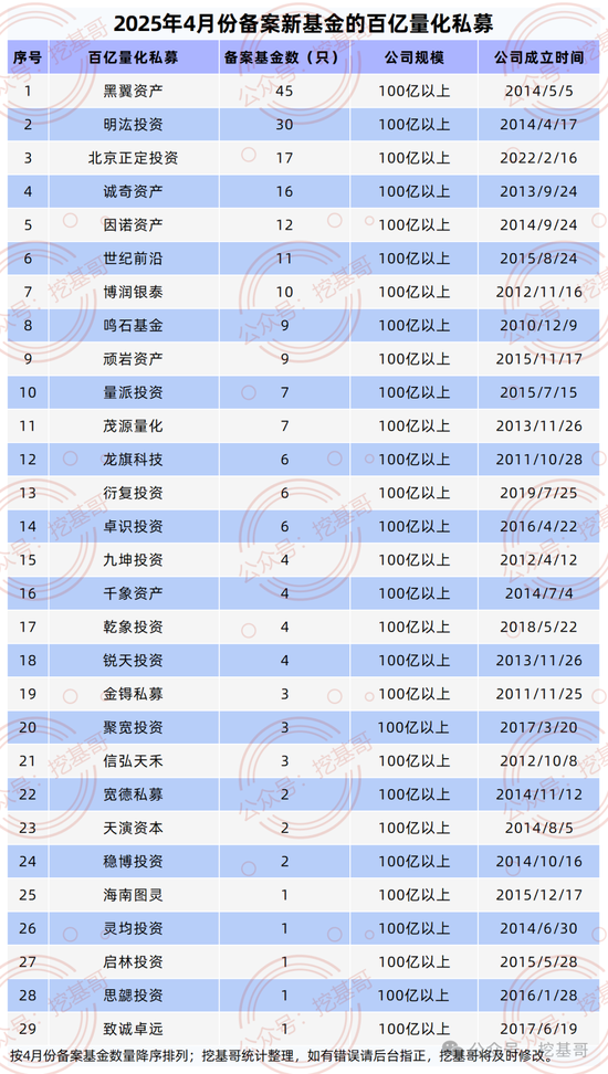 按备案基金数从高到低排序,4月份备案了新基金的29家百亿量化包括黑翼资产,明汯投资,正定投资,诚奇资产,因诺资产,世纪前沿,博润银泰投资,鸣石基金,顽岩资产,量派投资,茂源量化,龙旗科技,衍复投资,卓识投资,九坤投资,千象资产,乾象投资,锐天投资,金锝私募,聚宽投资,信弘天禾,宽德私募,天演资本,稳博投资,海南图灵,灵均投资,启林投资,思勰投资,致诚卓远。