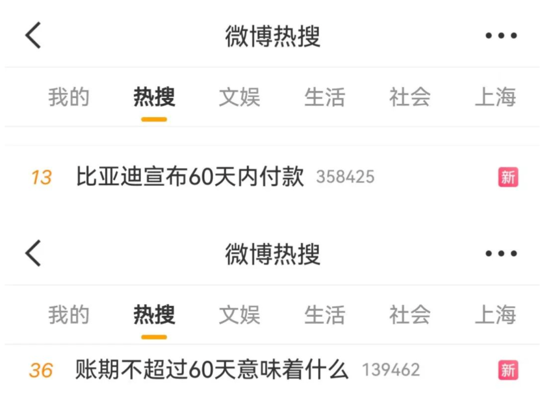 6月11日,“比亚迪宣布60天内付款”“账期不超过60天意味着什么”等词条,登上微博热搜。