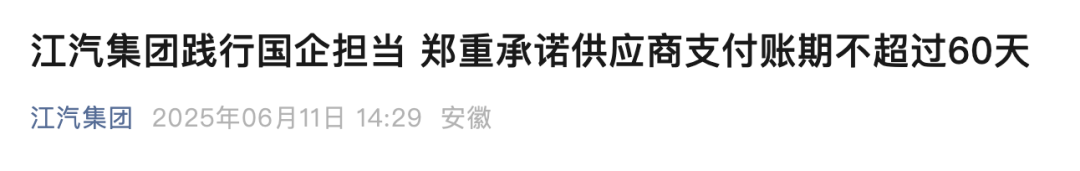 6月11日下午,江汽集团承诺:供应商支付账期不超过60天。同时,江汽集团将持续优化内部采购与财务结算流程,依托数字化管理手段,实现全流程实时监控,保障资金高效周转。