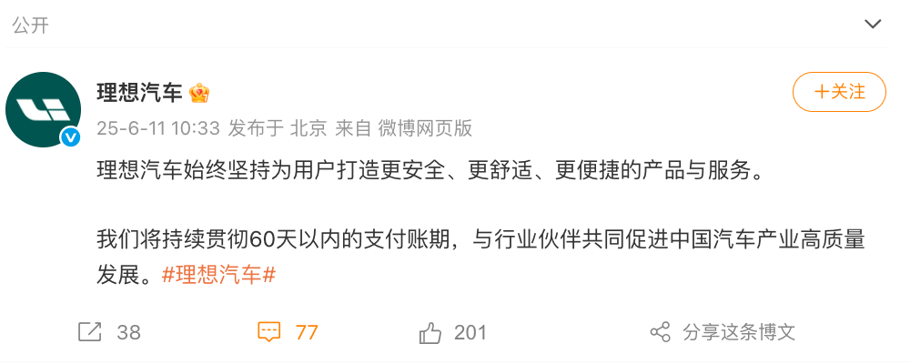 6月11日上午,理想汽车也发声明表示,将持续贯彻60天以内的支付账期,与行业伙伴共同促进中国汽车产业高质量发展。