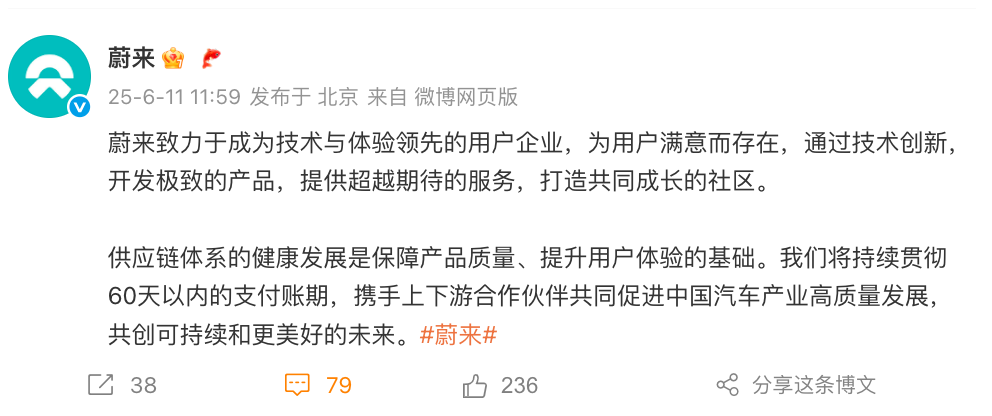 6月11日中午,蔚来汽车官方微博表示,将持续贯彻60天以内的支付账期,携手上下游合作伙伴共同促进中国汽车产业高质量发展,共创可持续和更美好的未来。
