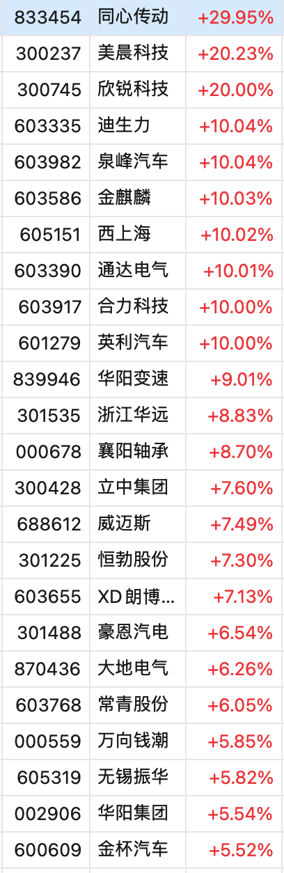 二级市场上,6月11日,A股汽车零部件概念股集体走强,截至收盘,同心传动30CM涨停,美晨科技、欣锐科技20CM涨停,迪生力、泉峰汽车、金麒麟、西上海、通达电汽、合力科技、英利汽车等多股涨停或涨超10%。