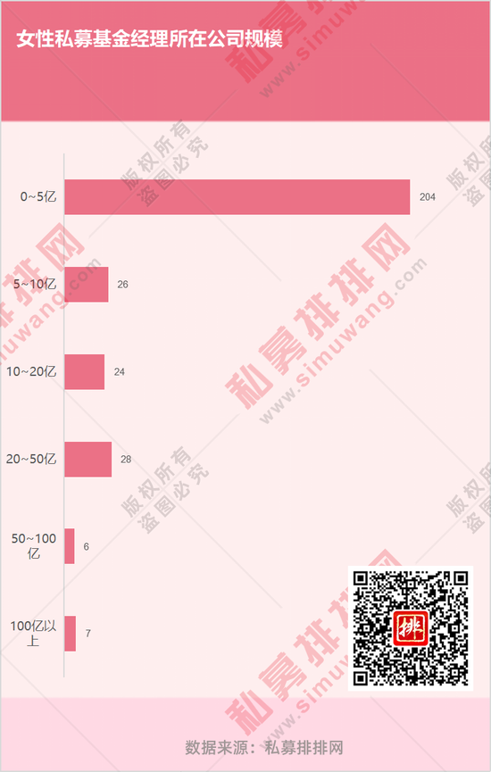 295位女性基金经理主要任职于5亿规模以下私募公司,占比达到69.15%,随着管理规模的增大,女性私募基金经理的占比越来越低,50亿以上私募中仅有13名女性基金经理。