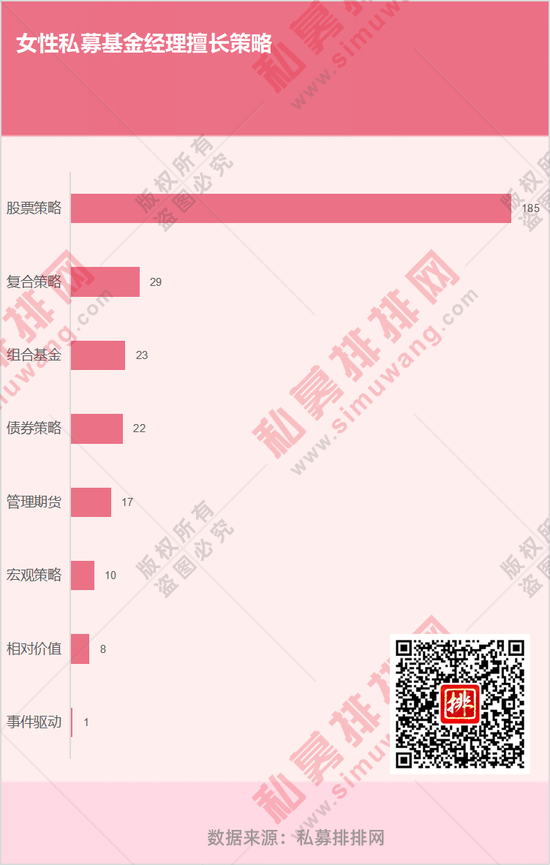 女性基金经理的核心策略中,有185人是股票策略,29人是复合策略,组合基金和债券策略分别为23人、22人,事件驱动策略与相对价值策略较少。