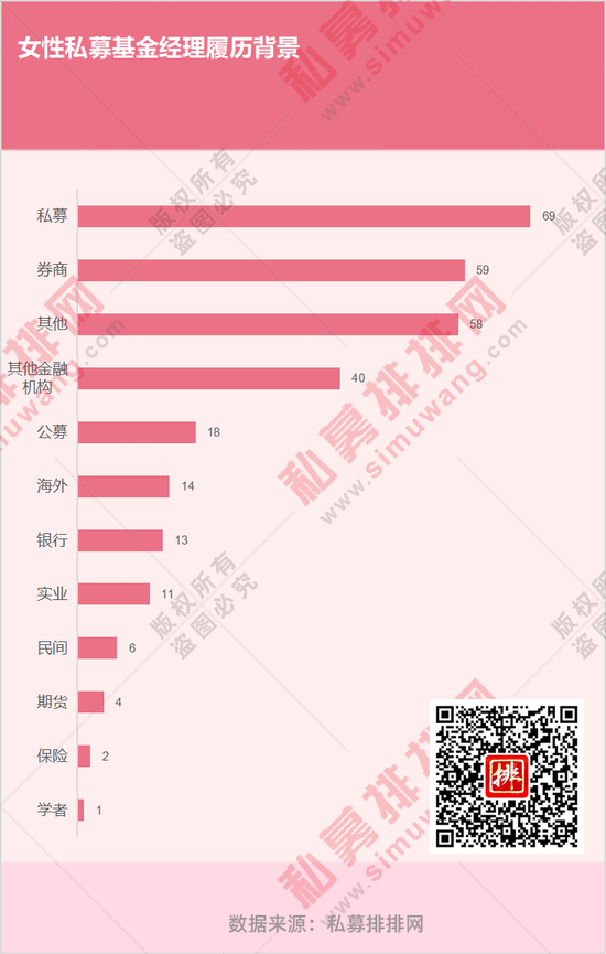 公司自主培养,是女性基金经理的主要来源之一,有69人是私募公司自己培养的基金经理。此外,还有不少女性基金经理拥有券商、公募等金融机构从业经历,公募派女性基金经理占比仅为6.10%。