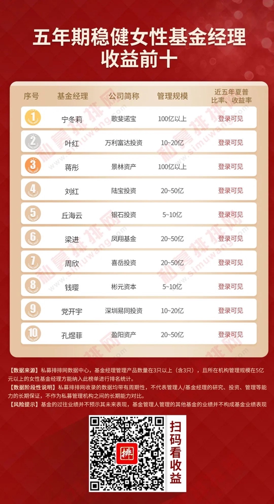 另有好投投资刘静、景熙资产胡红丽、雁丰投资刘婕、喜岳投资周欣、盈阳资产孔煜菲、锦成盛资产宋欣然等女性基金经理也均上榜五年期收益榜单。