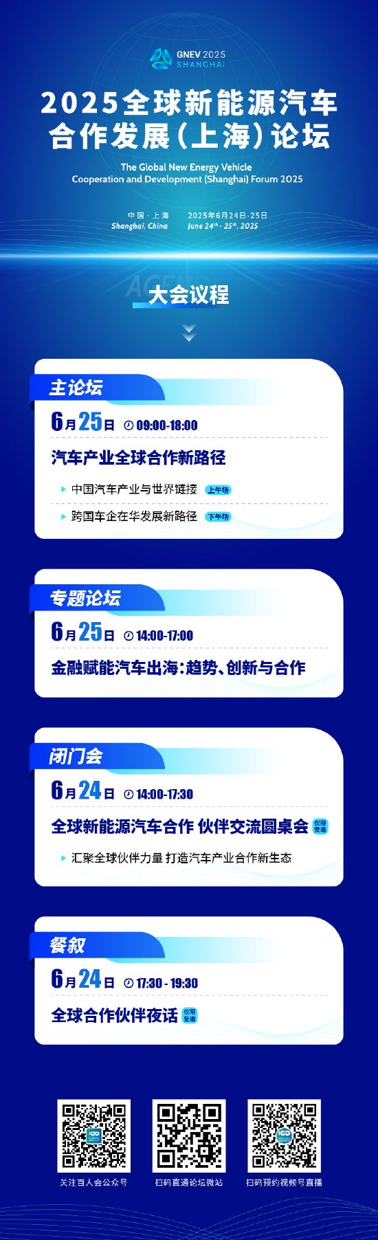 6月24日-25日,由中国电动汽车百人会主办的2025全球新能源汽车合作发展(上海)论坛(GNEV2025•Shanghai ),将在上海隆重举行。论坛以“汽车产业全球合作新路径”为主题,围绕全球汽车产业合作的新形势、中国汽车企业的国际化发展路径、跨国企业在华发展的新策略、金融服务汽车产业出海等多个话题展开交流与讨论。大会期间将举办3场活动,包括主论坛、专题论坛及闭门圆桌会。