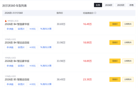 在懂车帝上,沃尔沃S60的经销商报价为16.49万—25.89万元,而厂商指导价为30.69万—38.49万元,以此计算,该车型的2026款B4智逸豪华版相当于最低打了近五折。