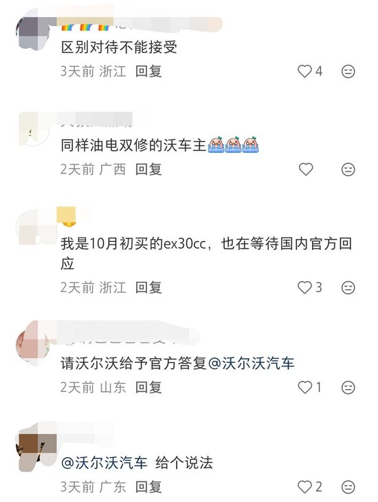 在社交媒体上,不少沃尔沃EX30车主也纷纷发声,称不能接受区别对待,要求沃尔沃官方给与答复与说法。