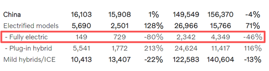 具体到中国市场,沃尔沃2025年销量为14.95万辆,相比2024年的15.64万辆下降4%。其中纯电车型销量仅2342辆,同比暴跌46%;燃油车销量12.26万辆,同比下降13%;虽然混动车型销量大增,但还是未能挽救整体的颓势。