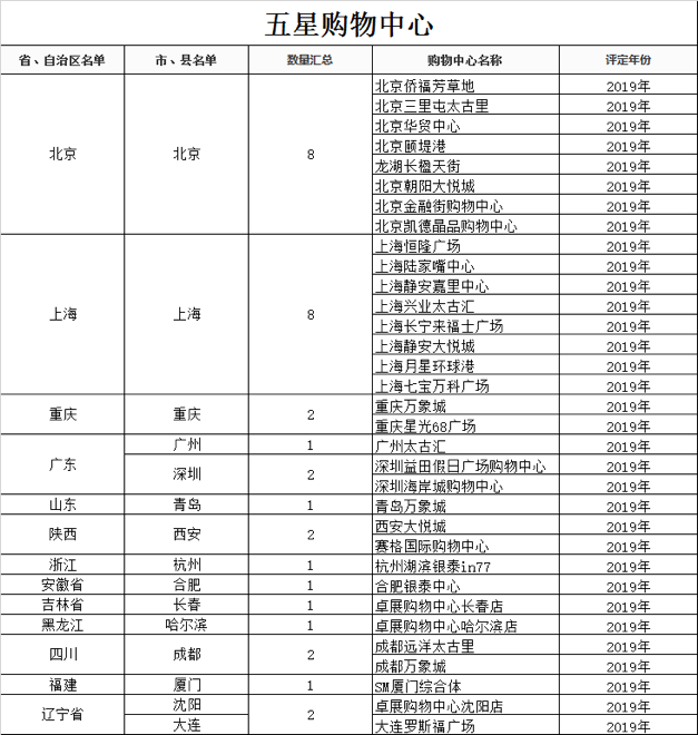 2019年,中国房地产业协会发布的《购物中心等级评价标准》受到了行业的高度关注。越来越多的购物中心从项目规划设计、硬件设施、运营管理和消费体验等维度进行自评与提升。该评级标准的发布,对如何打造一座真正为人们需要的购物中心起到了引领作用,截至2019年12月30日具有行业代表项目获得“五星购物中心”共33家。