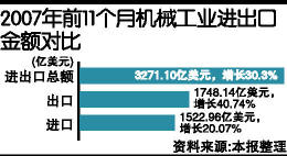 中国机械工业联合会执行副会长蔡惟慈21日在机械工业联合会2007年经济运行情况发布会上介绍,2001年我国机械装备自给率为71%,几年中该项指标持续发展,到2007年底已经超过82%。另外,我国从2006年起机械工业已由净进口变为净出口。2007年我国机械工业外贸出口增长40.74%,比进口增速高出20.67个百分点。 据介绍,前11个月我国机械工业实现贸易顺差225亿美元,占同期全国外贸顺差的9.43%。而以前机械工业一直是中国外贸的最大逆差行业之一。 2007年机械工业出口产品结构继续升级。技术附加值高的汽车、工程机械等行业出口增长迅猛,1至11月汽车行业出口同比增长52%,工程机械工业出口同比增长62.7%,均高于全行业同期增长40%的平均水平;一般贸易出口同比增长46.8%,高于加工贸易增长13个百分点;民营企业出口增长52.4%,高于全行业平均增幅12个百分点。这说明机械工业的外贸质量正在提高。 另据海关统计,2007年前11个月机械工业进出口总额3271.10亿美元,同比增长30.3%。其中出口1748.14亿美元,增长40.74%;进口1522.96亿美元,增长20.07%;占全国外贸进出口的比重分别为16.60%、15.84%和17.61%,比上年均有所增加。 但据蔡惟慈介绍,目前大型船用发动机、中高档数控机床的数控系统等仍要依赖进口。
