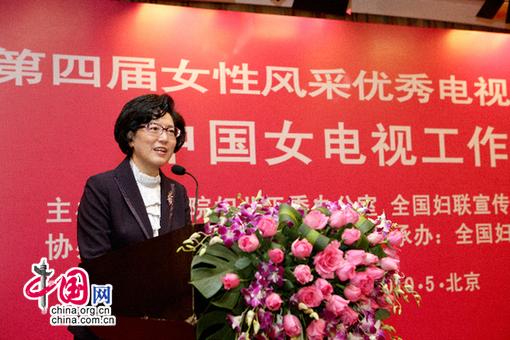 全国妇联副主席、书记处书记洪天慧在会上作了重要讲话。她指出电视作为当今社会的第一传媒,在引领舆论导向、传播先进文化、建设精神文明方面具有举足轻重的地位和作用。女性风采优秀电视作品推选展播活动自2002年开展以来,始终坚持以“贯彻落实男女平等基本国策,发挥电视媒体优势,为妇女发展服务”为宗旨,通过对优秀女性题材电视作品的展播、表彰和鼓励,大大激发了广大电视媒体和电视工作者宣传妇女新作为、展示妇女新风采、塑造妇女新形象的热情,在大力弘扬尊重妇女、男女平等的良好社会风尚中发挥了积极作用。她强调贯彻男女平等基本国策,一个很重要的途径就是借助电视等媒体。希望广大电视工作者特别是女电视工作者要增强性别敏感度,在宣传报道中重视女性、关心女性、体现女性的价值,在创作过程中提高作品的表现力、感染力和艺术魅力,把更多更好反映妇女发展的作品奉献给大家,为提升全社会的性别平等意识、促进整个社会的文明进步不懈努力。