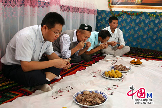 艾则孜·爱迪里斯老人招呼客人品尝新疆特色美食(摄影 中国网 詹海涛)