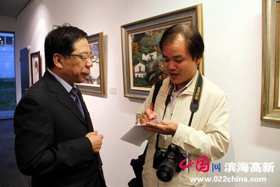 天津画院党组书记陈英杰在“时代丹青东方魅力—中国·天津画院美术作品(柏林)展”上接受《人民日报》驻德记者采访。