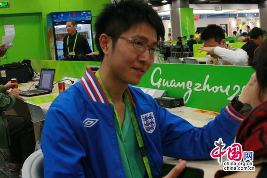 从小到大,算上这次广州亚运会是唐海源第二次来到中国,虽然身为泰国的体育记者,但是在这里他根本不觉得自己是个外国人,别人也看不出他是外国人,黑头发黑眼睛黄皮肤,加上一副眼镜的衬托,俨然一个斯斯文文的小书生模样,虽然生长在泰国,但在他心里,唐海源始终为身上流着中国的血脉而自豪。