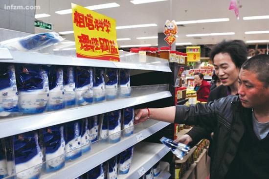 2011年3月18日,北京石景山区永辉超市,货架上挂出了“相信科学,理性购盐”的提示牌。 (新京报 郭铁流/CFP/图)
