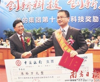 年轻的工程师李金波成为美的今年最受瞩目的明星员工。凭借在“变频空调舒适性研究”项目中的成功技术创新,他从老板何享健手中接过“重大科技创新奖励个人奖”,奖金高达30万元(如图,陈志杰摄)。