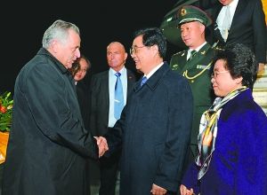 当地时间18时许,胡锦涛乘坐的专机抵达维也纳施威夏特国际机场,胡锦涛和夫人刘永清受到奥地利劳工、社会事务及消费者保护部长洪德施托费尔的热情迎接。