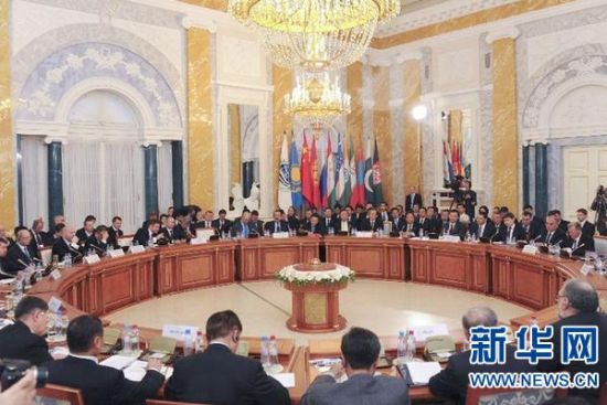 11月7日,中国国务院总理温家宝在俄罗斯圣彼得堡出席上海合作组织成员国总理第十次会议并发表讲话。这是会议现场。 新华社记者马占成摄