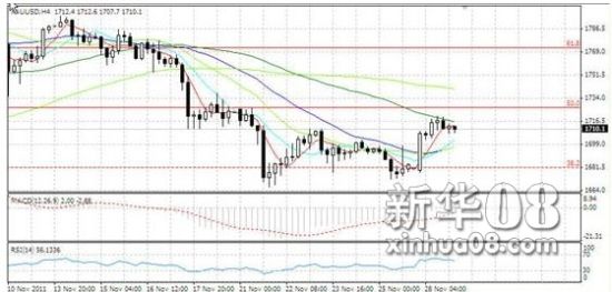 黄金价格周一大幅走高。周末有传言称,国际货币基金组织(IMF)将向意大利提供6000亿欧元援助的消息,风险情绪骤然升温,美元大幅走软,推动金价在亚洲时段强劲上扬,后此消息被否认,但投资者仍冀望欧元区当局能出台新举措遏制欧债危机,金价守住涨幅。进入欧美时段,德国下议院预算委员会周一批准了包括扩容措施在内的欧洲救助基金扩展的提议,该提议将于本周接受欧洲财长们的讨论。同时,德国总理默克尔和法国总统萨科齐计划采取包括快速达成新稳定条约在内的更强有力方法,抗击欧债危机。风险情绪进一步改善,金价扩大涨幅。不过,在1720的强阻位遇阻回落。后市看,由于市场对欧盟出台救助措施的预期升温,风险情绪好转,金价有望跟随风险货币进一步反弹。