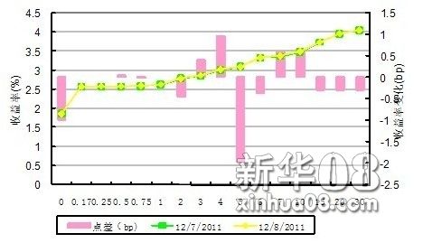 新华08网北京12月8日电(记者胡章俊 马蓉) 12月8日债市收益率略有上行。长江证券宏观债券组观点称,今日债市较为弱势,多数券种收益率有所上行。国债走势弱于政策性金融债,而信用产品方面则多现上行,短融的表现相对较优。央行在周二进行了千亿回笼之后,今日继续了回笼了360亿元。尽管对于资金面并未造成巨大冲击,但是对于市场放松预期来说有所打击,此次降准看来只是对于外汇占款流出的对冲,并未开启宽松周期。同时由于明日将出炉11月份经济数据,市场也相对来说比较谨慎。