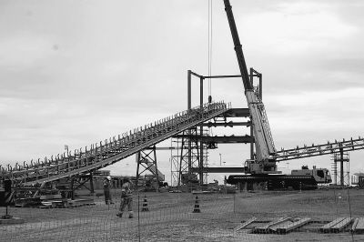 工人们正在亚苏港施工现场安装铁矿石滚动式运输带。