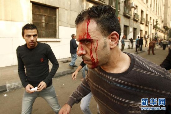 12月17日,在埃及首都开罗,一名示威者在冲突中受伤留血。埃及卫生部发布的最新数据显示,开罗16日发生的示威冲突已经导致8人死亡、317人受伤。 新华社发(努里摄)