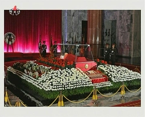中国中央电视台引用朝鲜中央电视台播放的画面显示,金正日的遗体安放在水晶棺里,身着平时爱穿的人民装,水晶棺周围也装饰着红色的金正日花和白色的菊花。