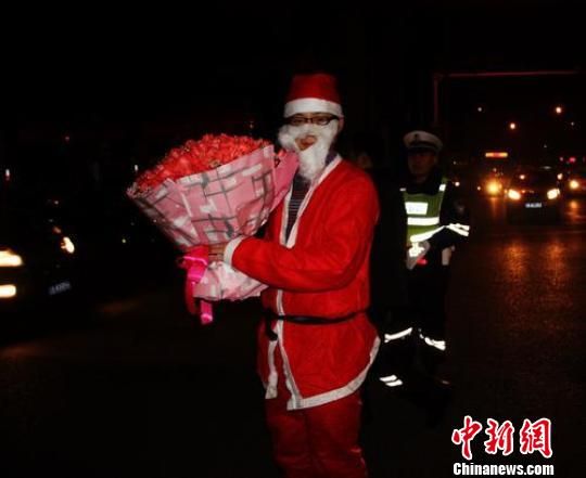 中新网重庆12月25日电(韩璐)节日总是少不了鲜花的映衬。25日晚,记者在重庆三峡广场看到,一个个乔装打扮成“圣诞老人”的鲜花配送员,手捧鲜花,穿梭在人群之中。他们身着圣诞老人服装、族蹬黑皮靴、脸戴白胡须。此番景象引起不少逛街市民围观。