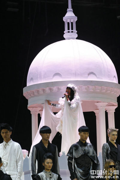 资料图:2011年10月28日张咪现身中国国际时装周,为某设计师新品发布助阵献唱。