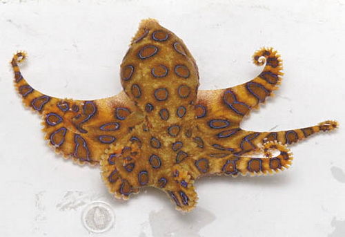 澳洲蓝环章鱼:常在澳大利亚沿海水域出没。这种软体动物的身长仅15厘米,腕足上有美丽的蓝色环节,遇到危险时,身上和爪上深色的环就会发出耀眼的蓝光,向对方发出警告信号。