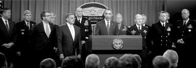 ▲1月5日,总统奥巴马(中)与国防部长帕内塔(前排左二)和参谋长联席会议主席邓普西(前排右二)及军方官员一道出席记者会。新华社发